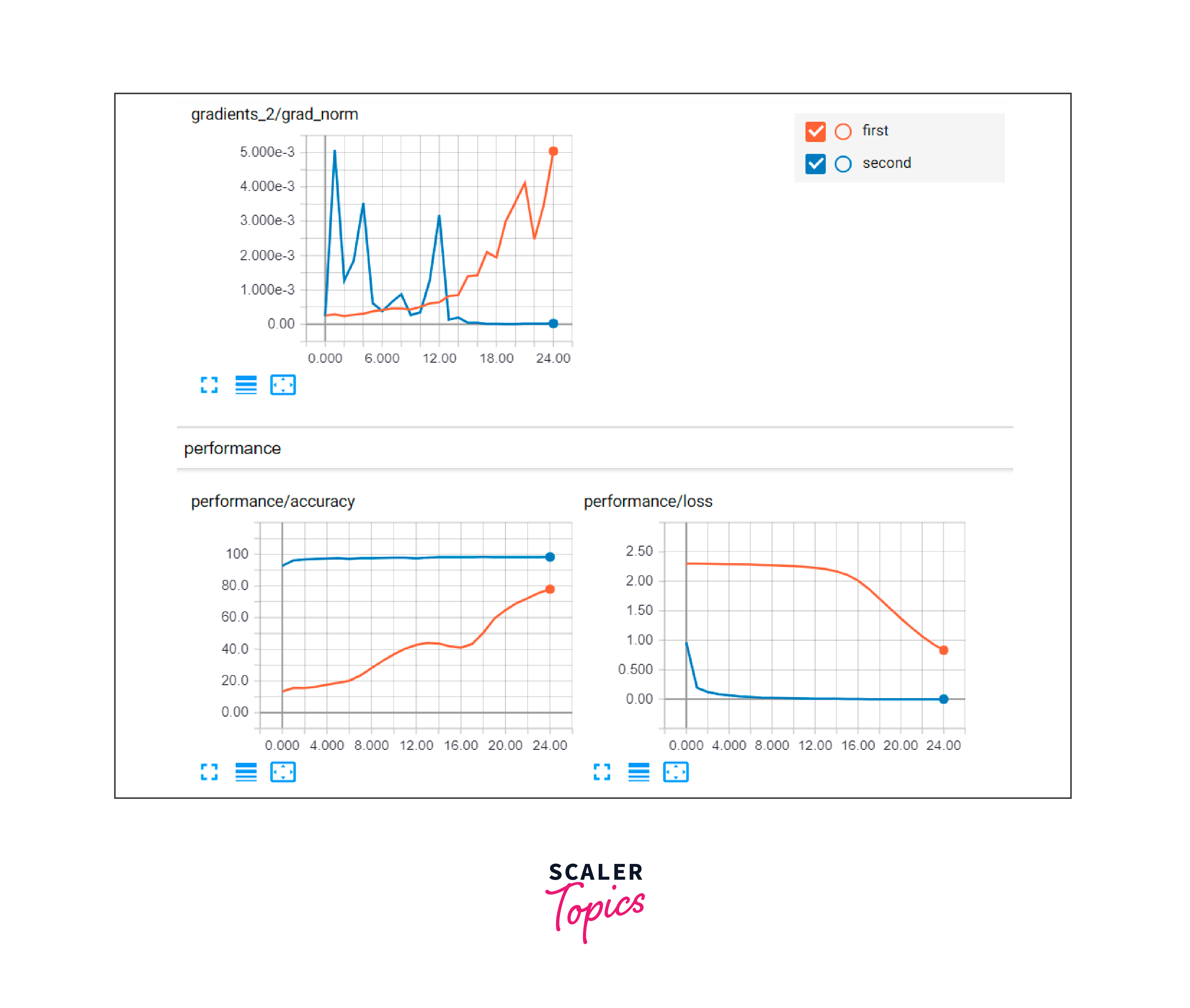 Scalars View: Shows the plots of scalar values over time, allowing you to compare multiple runs and metrics.