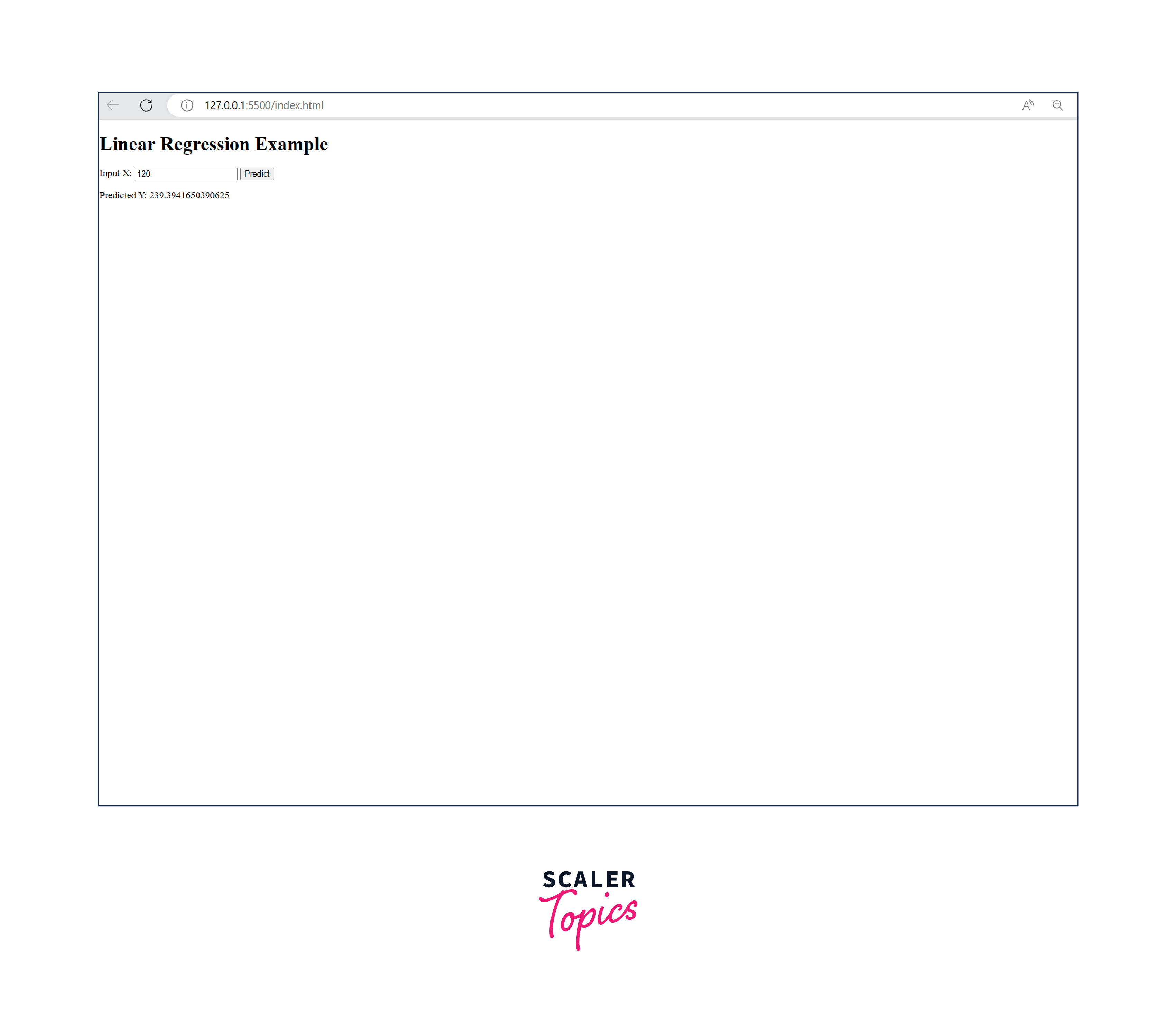 Step 4: The HTML part contains an input field to enter the value of X, and when the "Predict" button is clicked, it calls the predict() function to predict the corresponding Y value based on the trained model.
