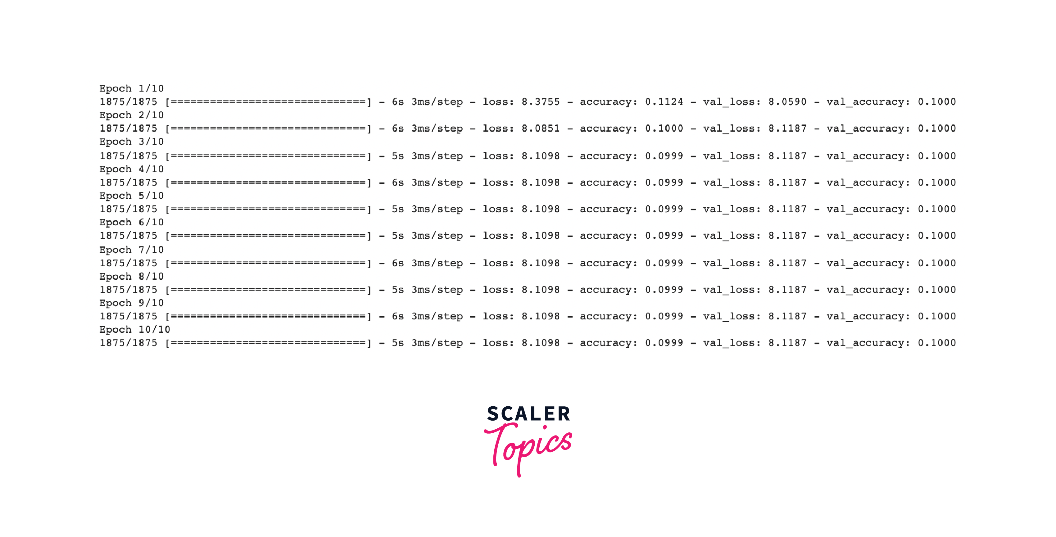 As the model trains, the loss and accuracy metrics are displayed. This model reaches an accuracy of about 0.84 (or 84%) on the training data.