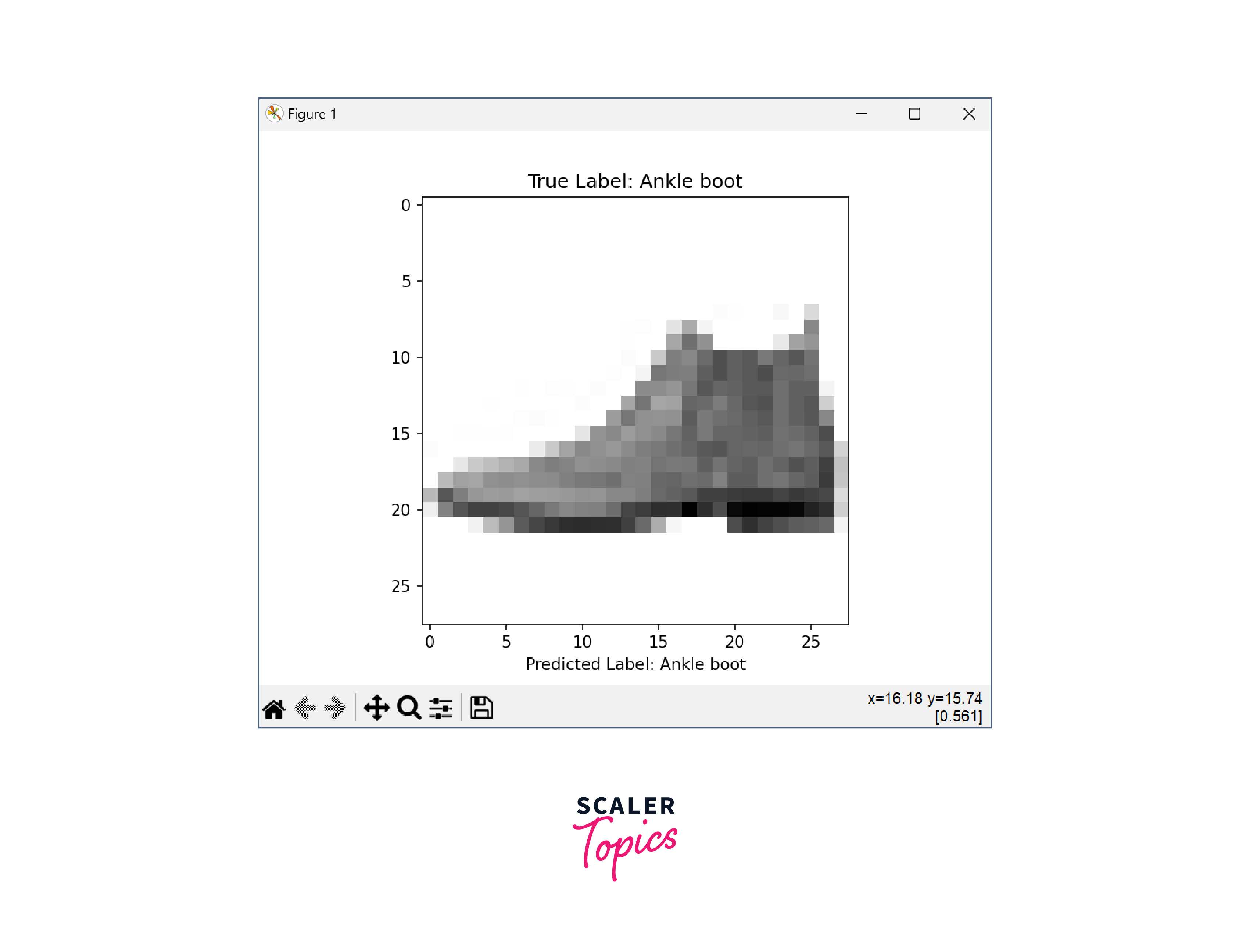 This code includes the necessary steps for importing libraries, loading and preprocessing the Fashion MNIST dataset, defining and training the object detection model, evaluating its performance, and making real-time predictions on a test image from the dataset. The code uses a simple convolutional neural network (CNN) architecture for image classification with ten output classes corresponding to the ten fashion items in the dataset.