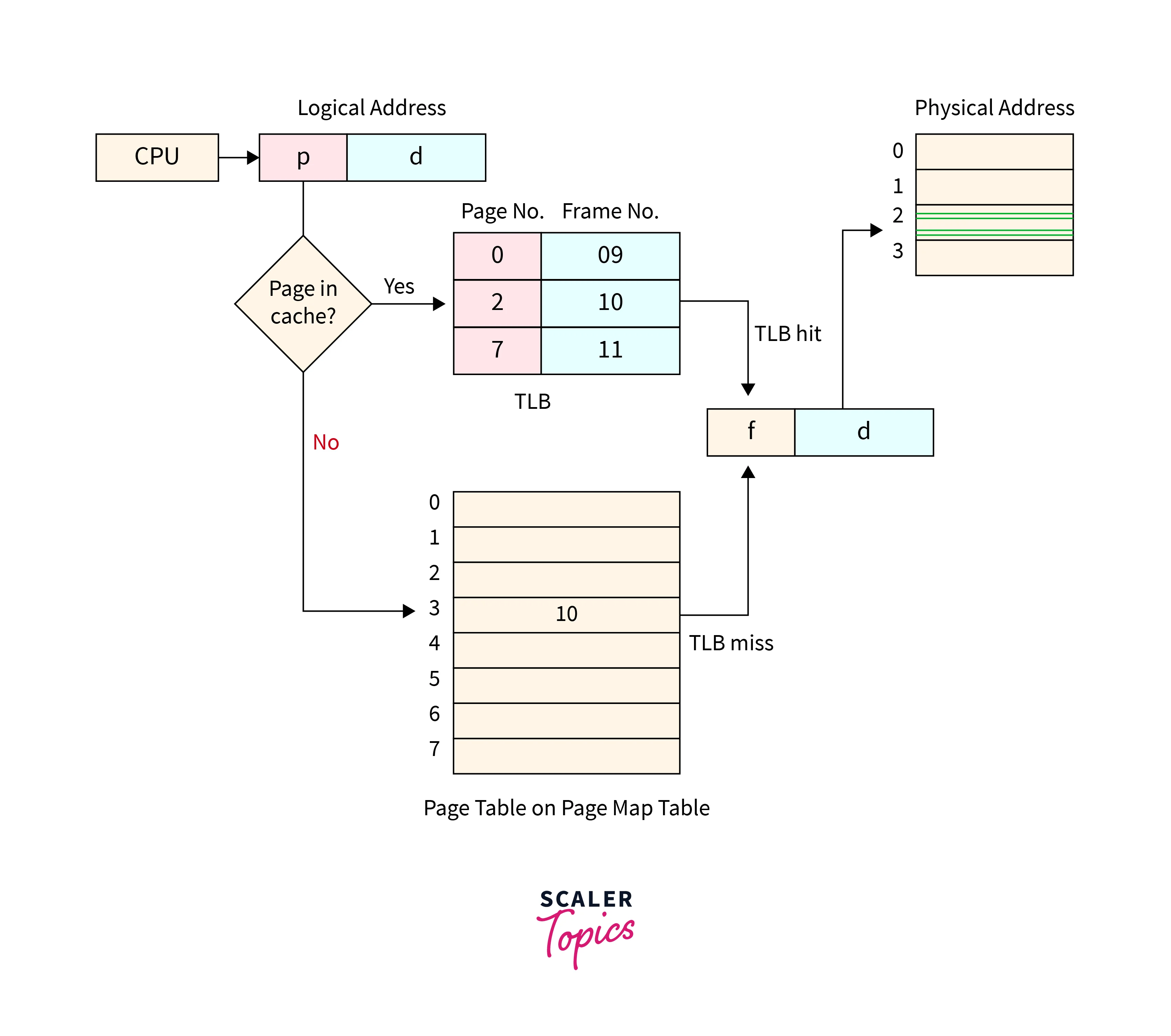 - CPU checks for a match between the generated virtual address and the entries stored in the TLB.