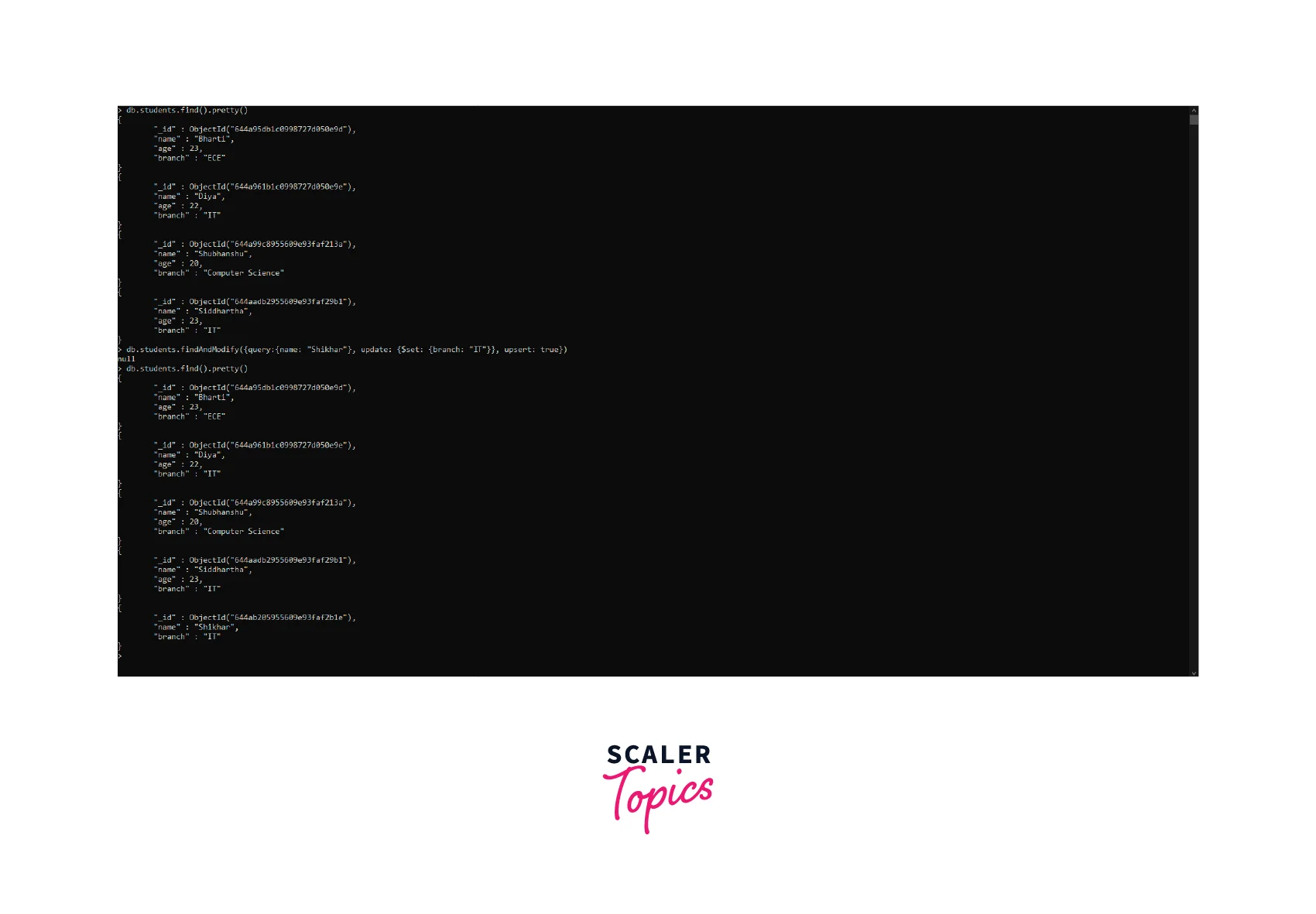 Explanation: In this example, if no document is found in the "students" collection that matches the query { name: "Shikhar", branch: IT }, the findAndModify() method will create a new document with the fields "name" and "branch" set to the specified values, and then apply the $set update operator to modify the "branch" field to "IT". The modified document will be returned due to the new option set to true.