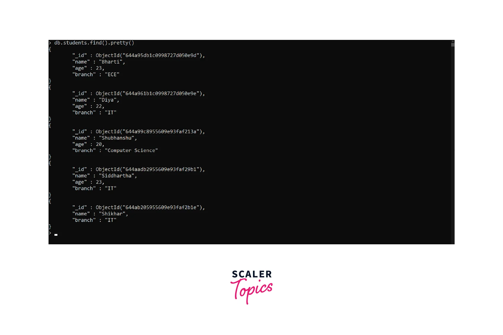 Let's say we have a database named "scaler" and a collection named "students" which contains two documents that hold information about different students.