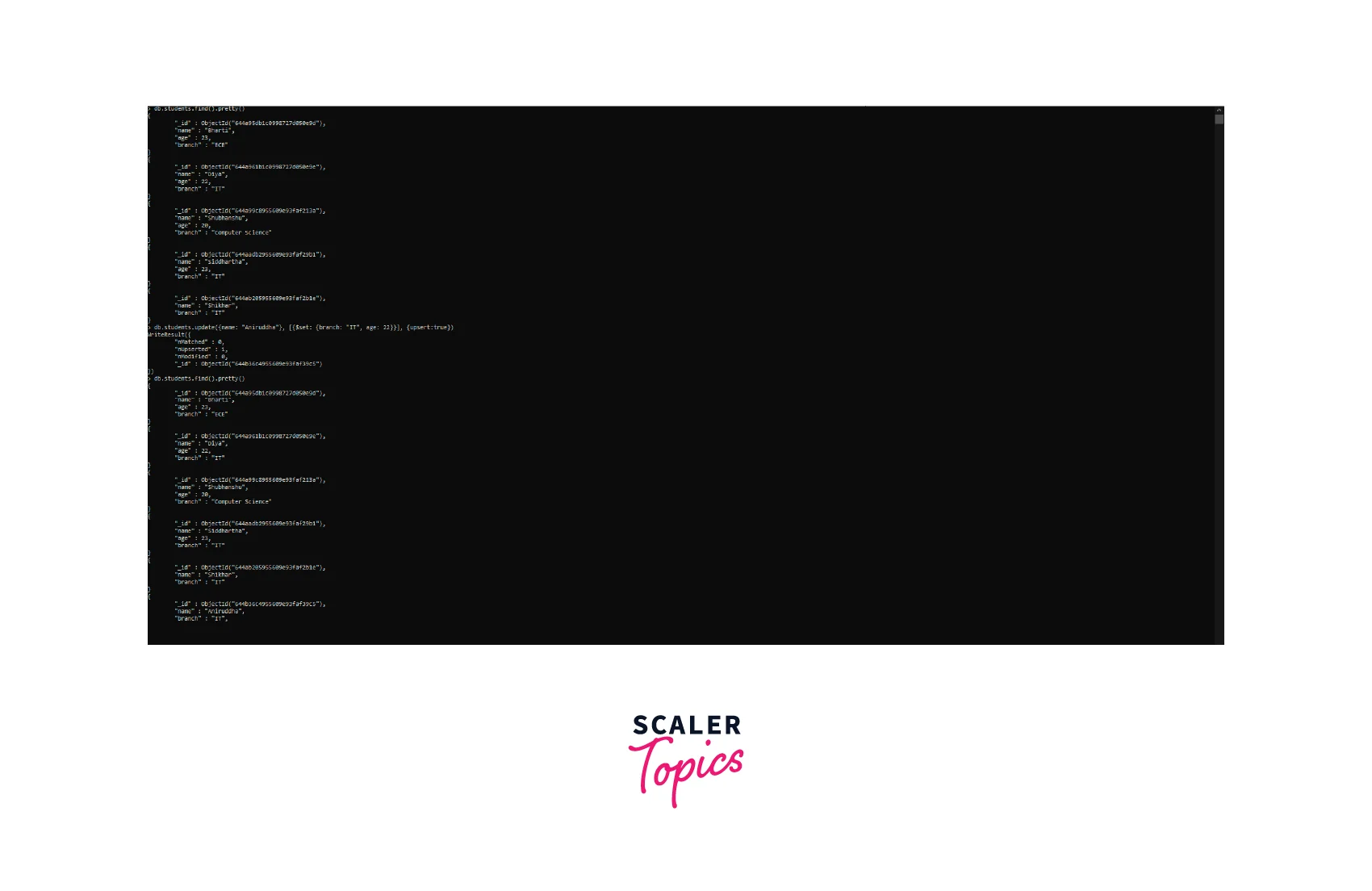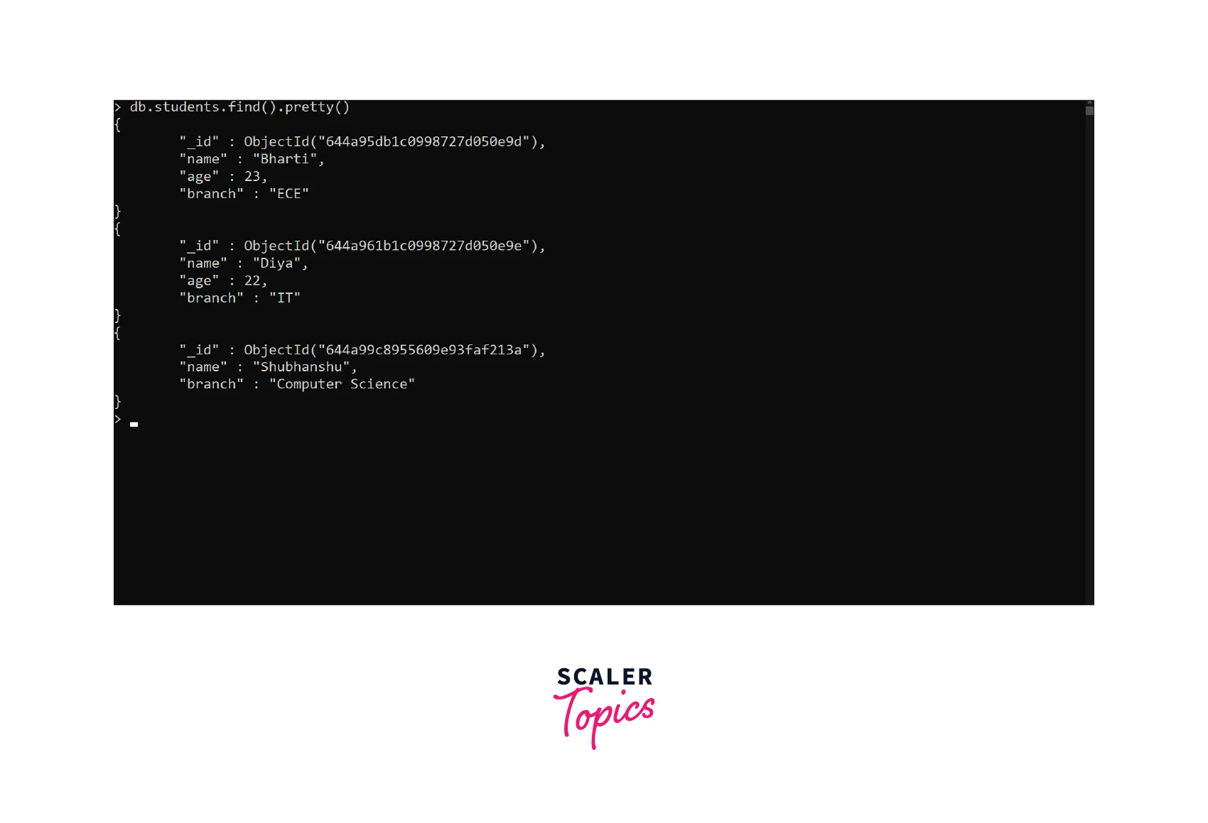 Let's say we have a database named "scaler" and a collection named "students" which contains three documents that hold information about different students.