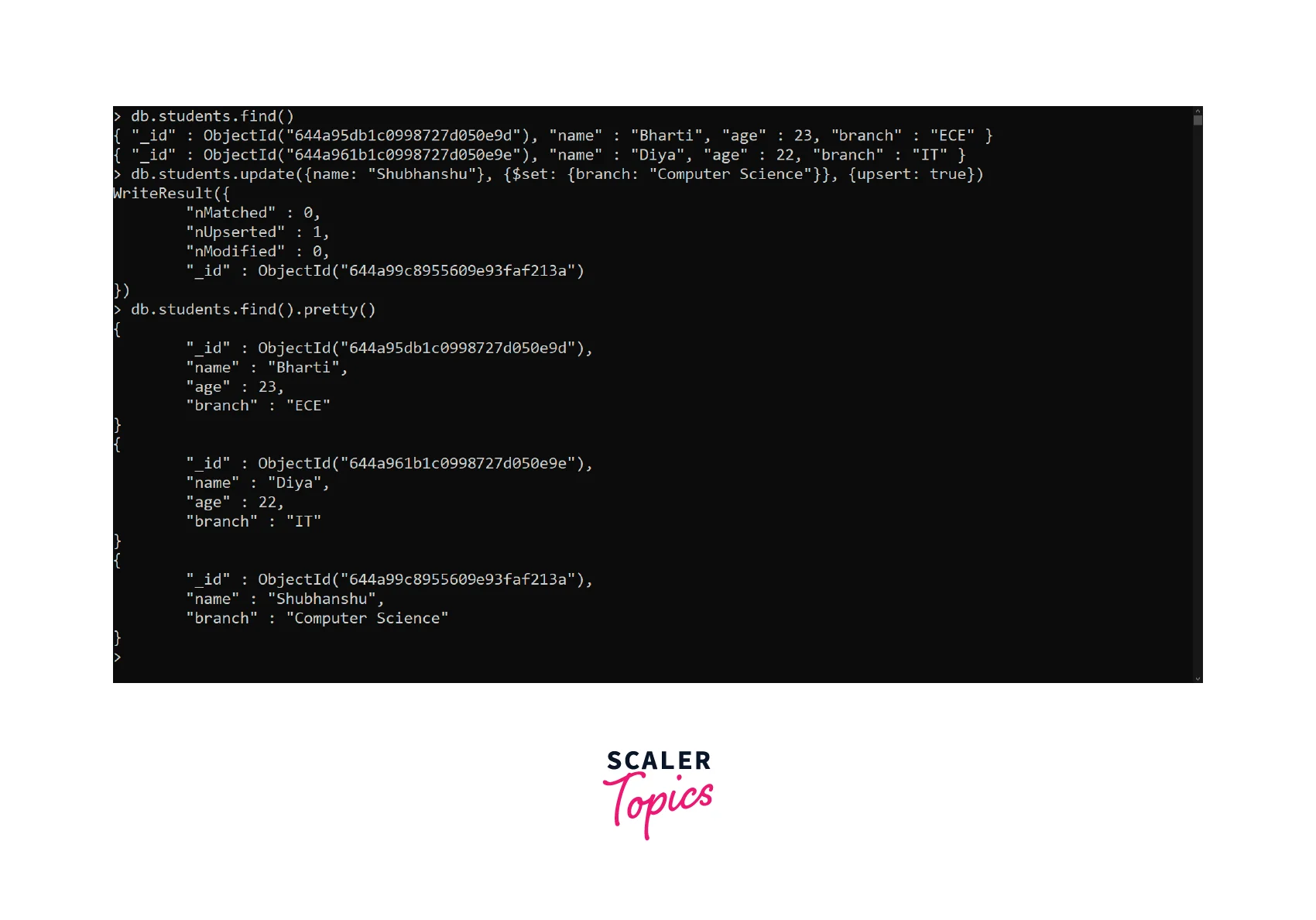 Explanation: In this example, the upsert: true option enables the upsert operation. If a document with _id value of 644a99c8955609e93faf213a exists, it will be updated with the specified "name" and "department" values. Otherwise, a new document with _id value of 644a99c8955609e93faf213a, "name" value of "Shubhanshu", and "branch" value of "Computer Science" will be inserted.
