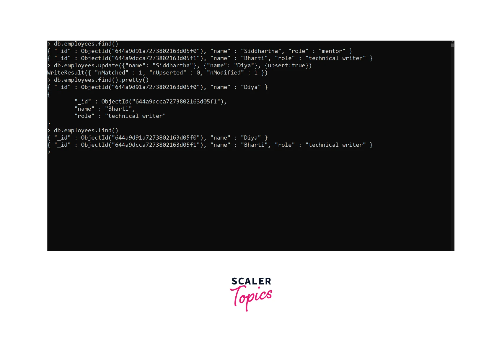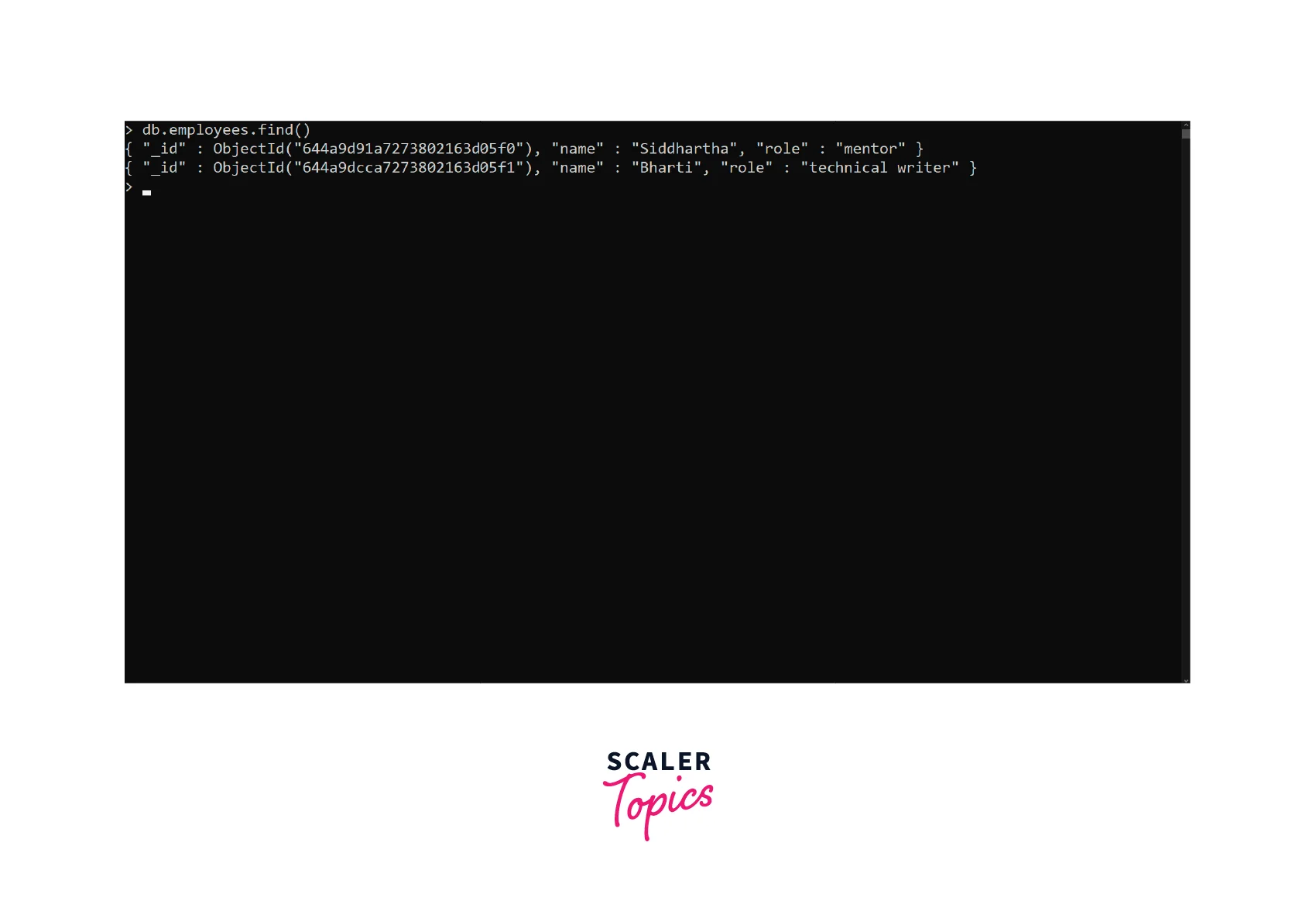 Let's say we have a database named "scaler" and a collection named "employees" which contains two documents that hold information about different employees.