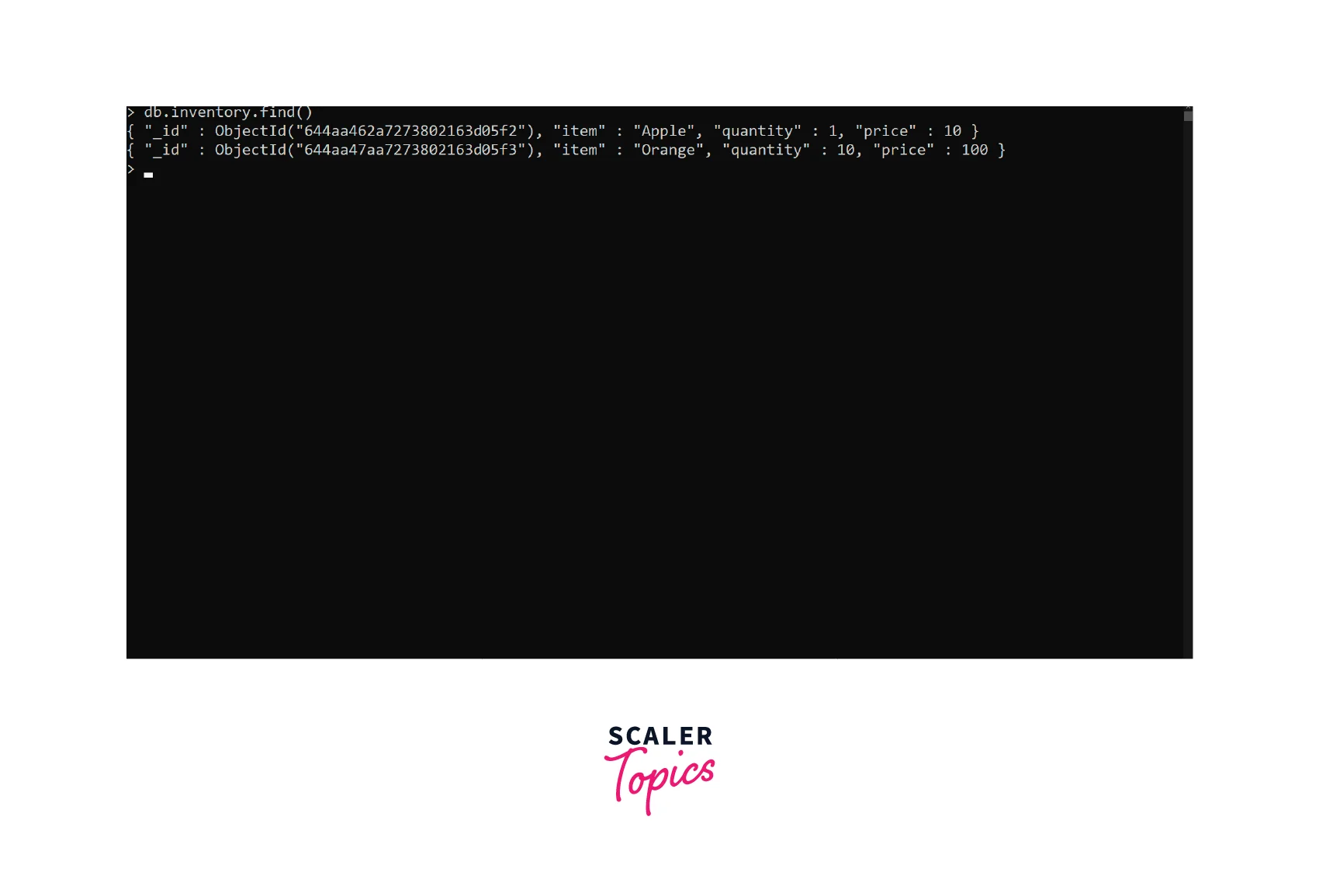 Let's say we have a database named "shop" and a collection named "inventory" which contains two documents that hold information about different inventory items.