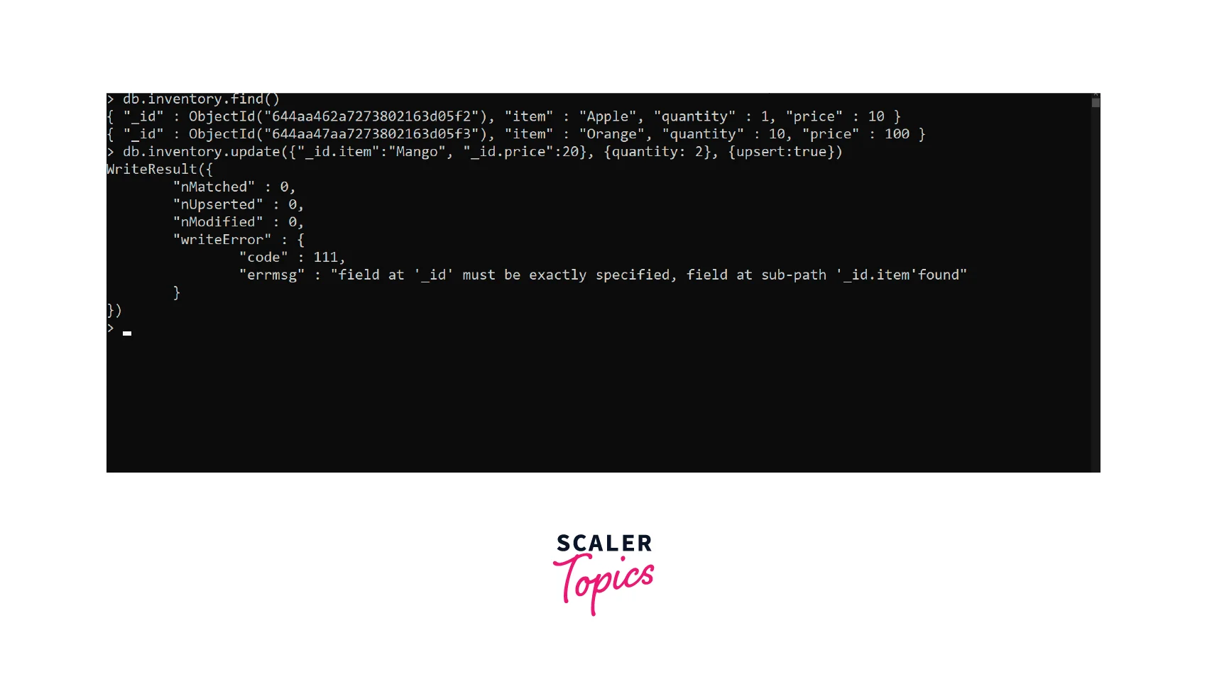 In this example, if a document with _id.name "Mango" and _id.price 20 is found, it will be updated with the new values for item and price. If no matching document is found, a new document will throw an error.