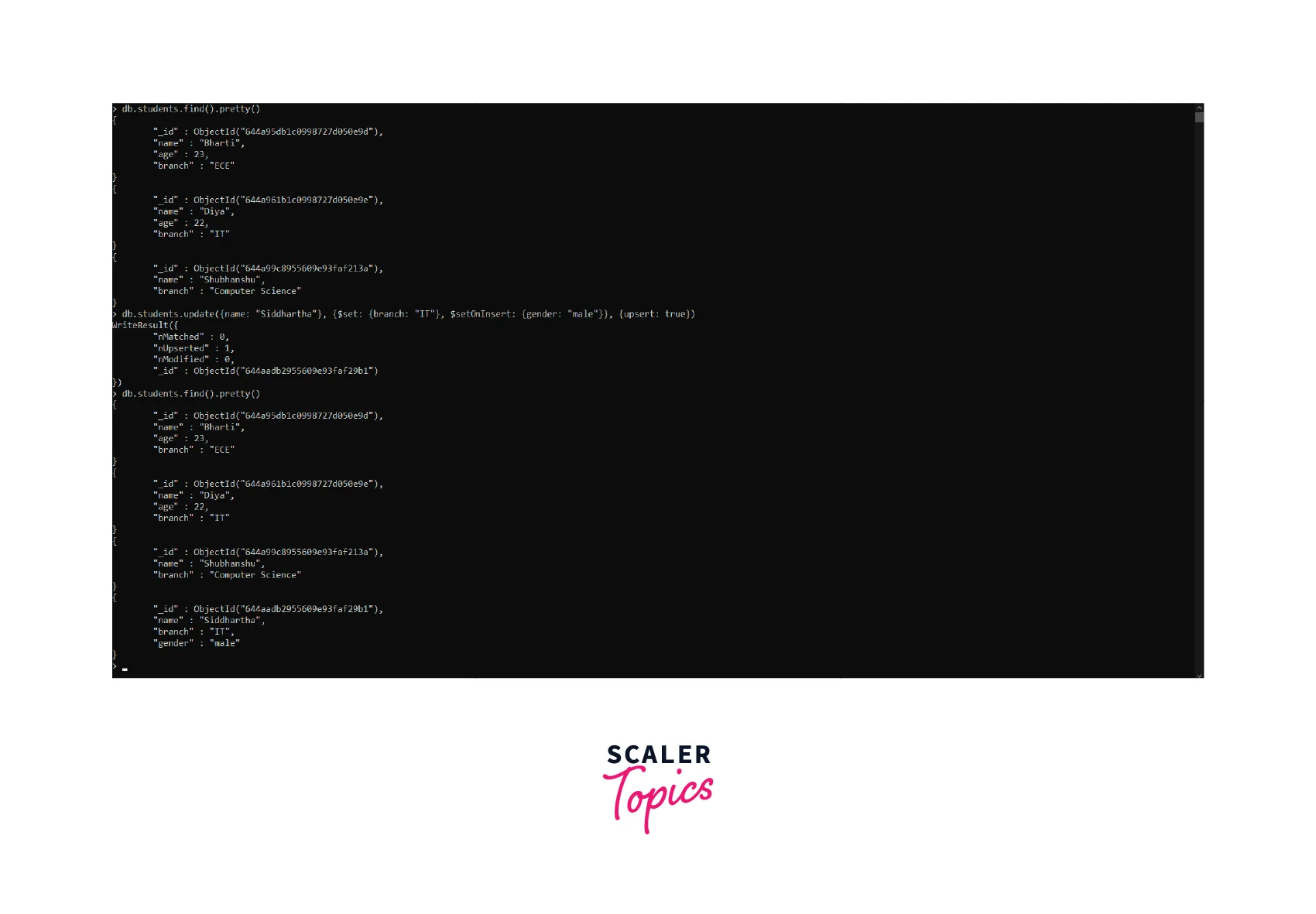 We will now create a new document in the student's collection and set the value of the upsert option to true where the aggregation pipeline is used with the upsert option to perform an upsert operation: