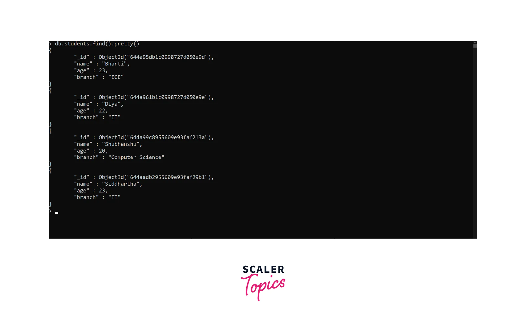 Let's say we have a database named "scaler" and a collection named "students" which contains four documents that hold information about different students.