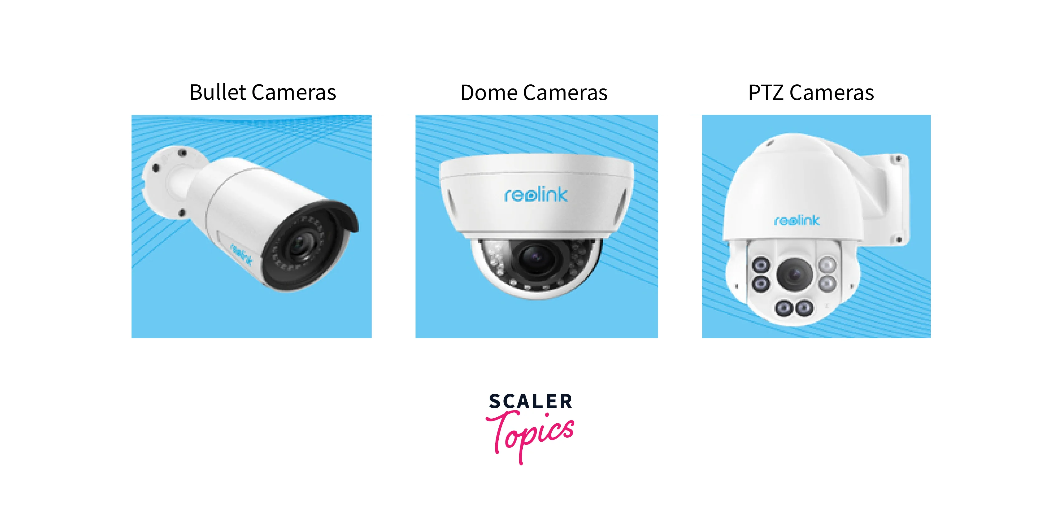 These cameras have a dome-shaped enclosure, offering a discreet and compact design suitable for indoor surveillance. - Bullet cameras: