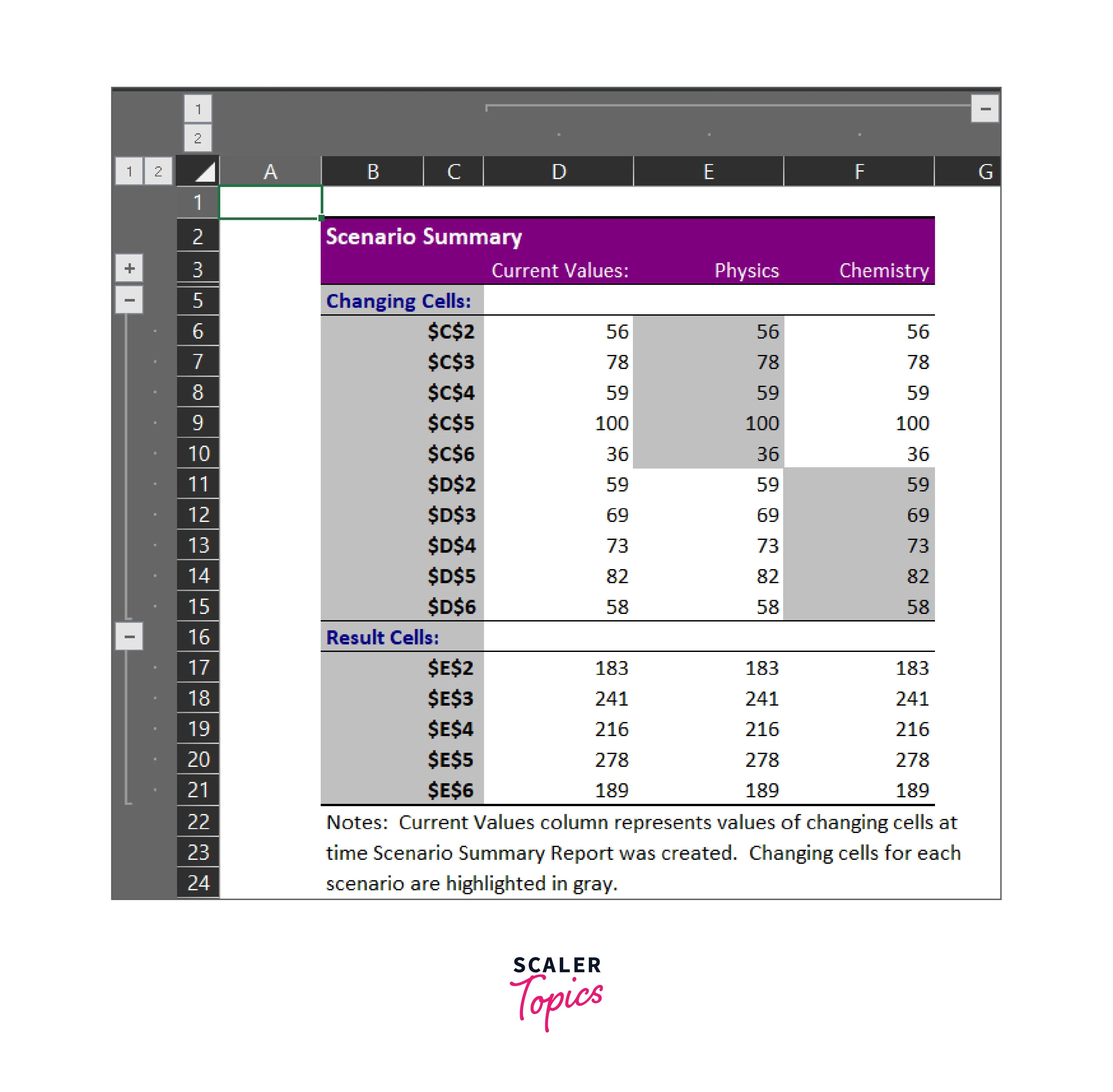 Click on "Summary" to create a summary report of the scenarios. The report will show the input variables for each scenario and the resulting output value.