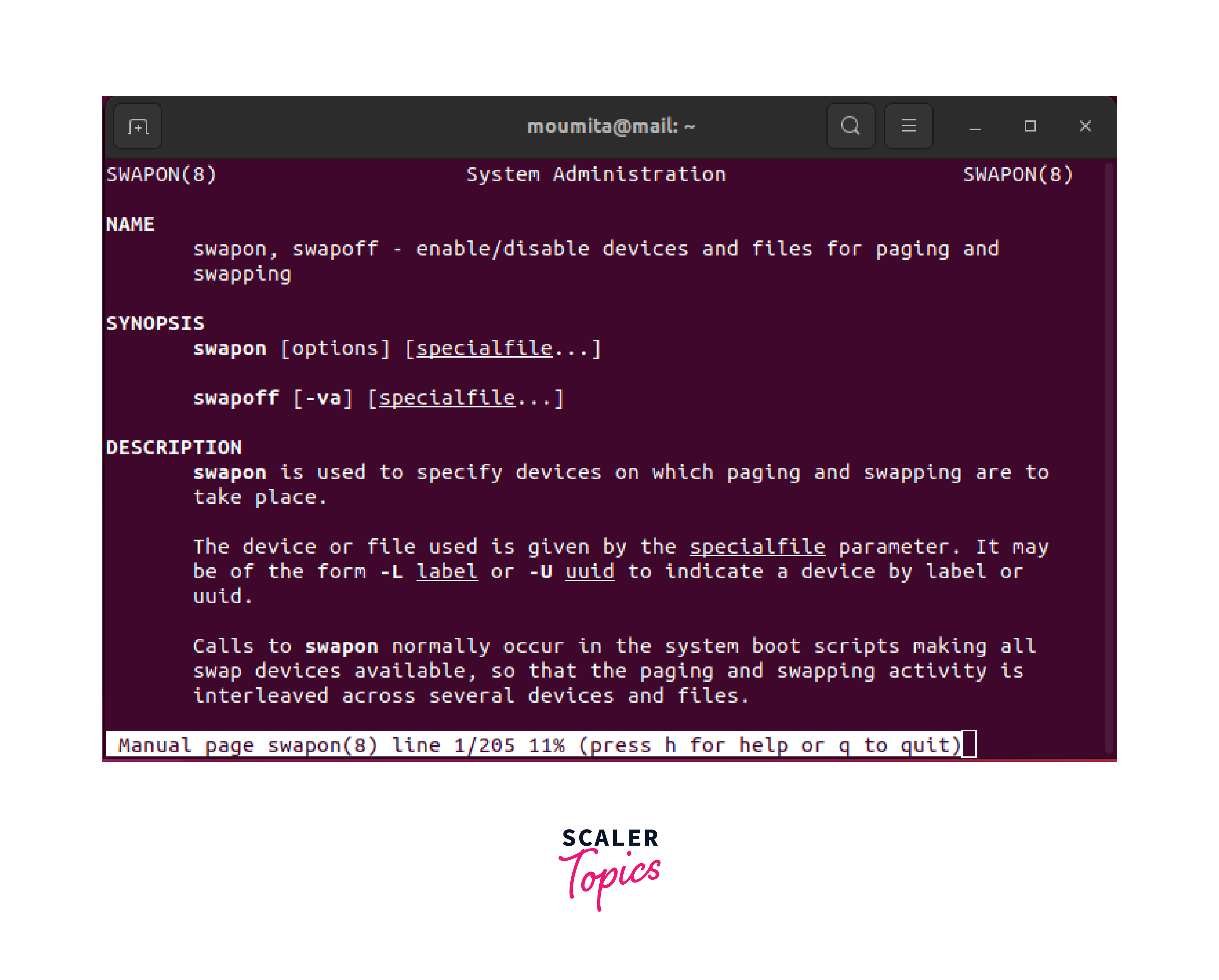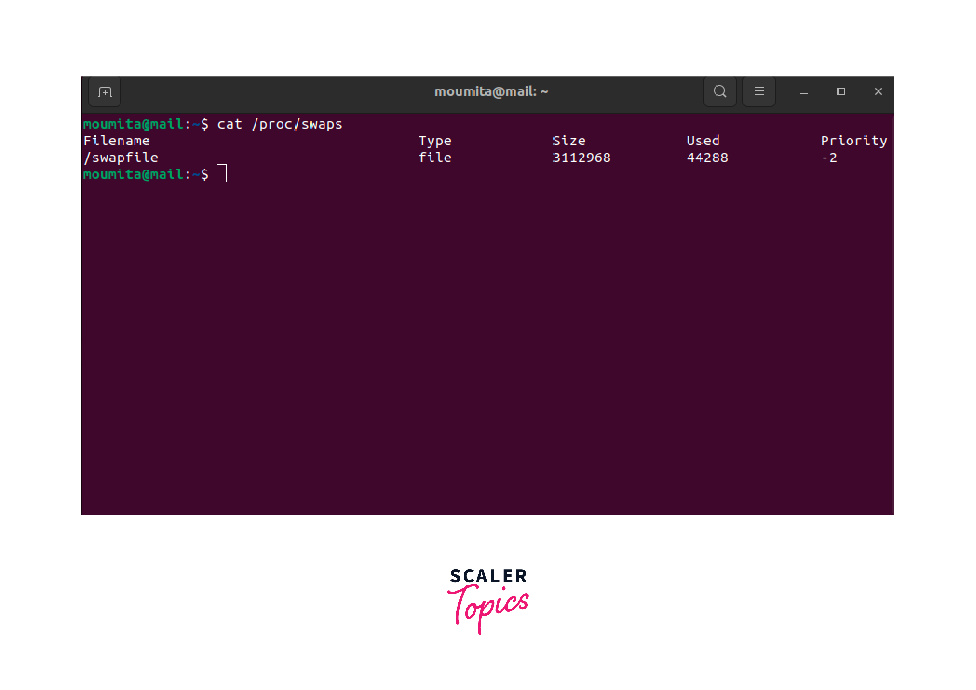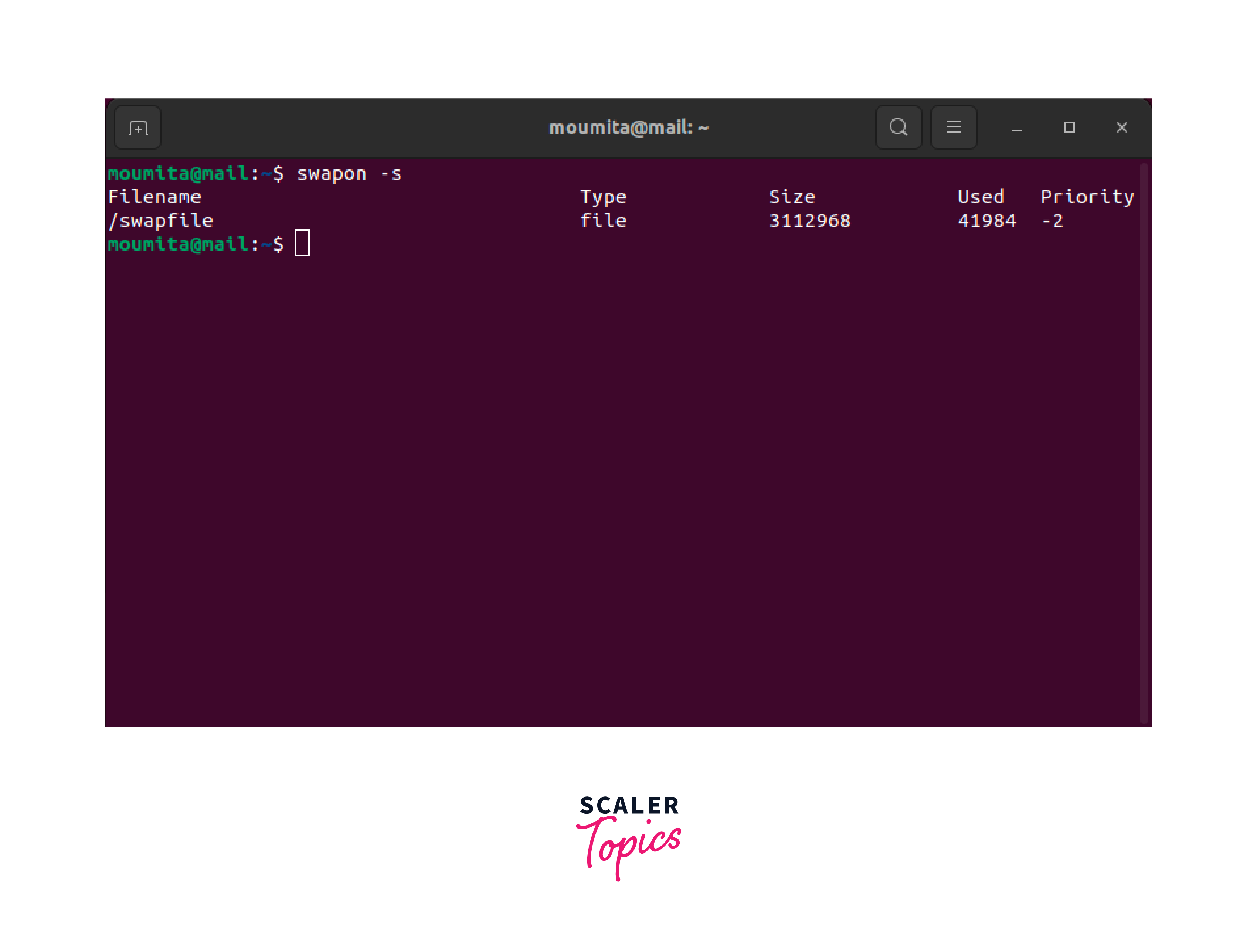 swapon: This command displays the active swap spaces on the system, along with their paths and sizes.