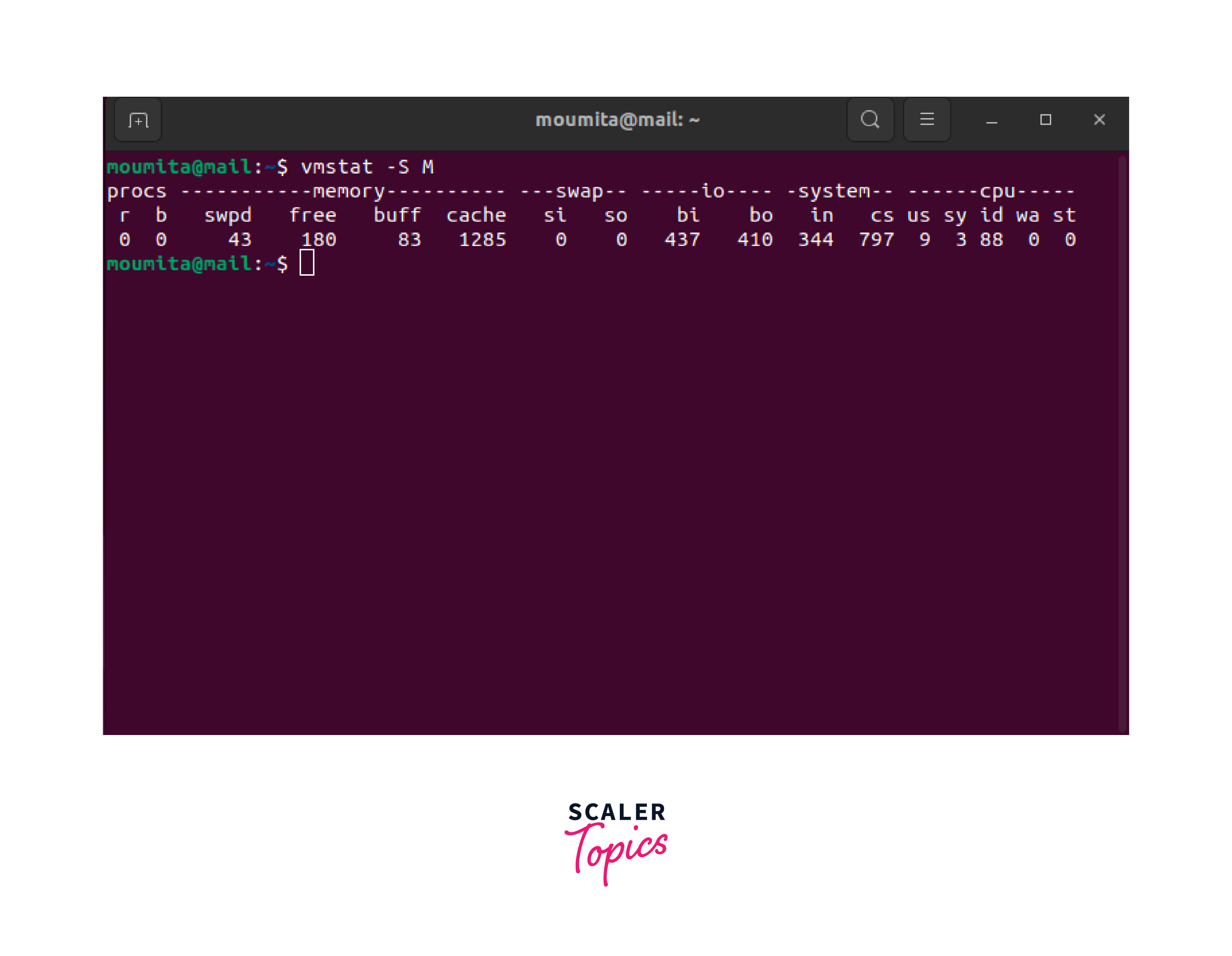 vmstat: This command displays information about virtual memory statistics, including swap space usage.
